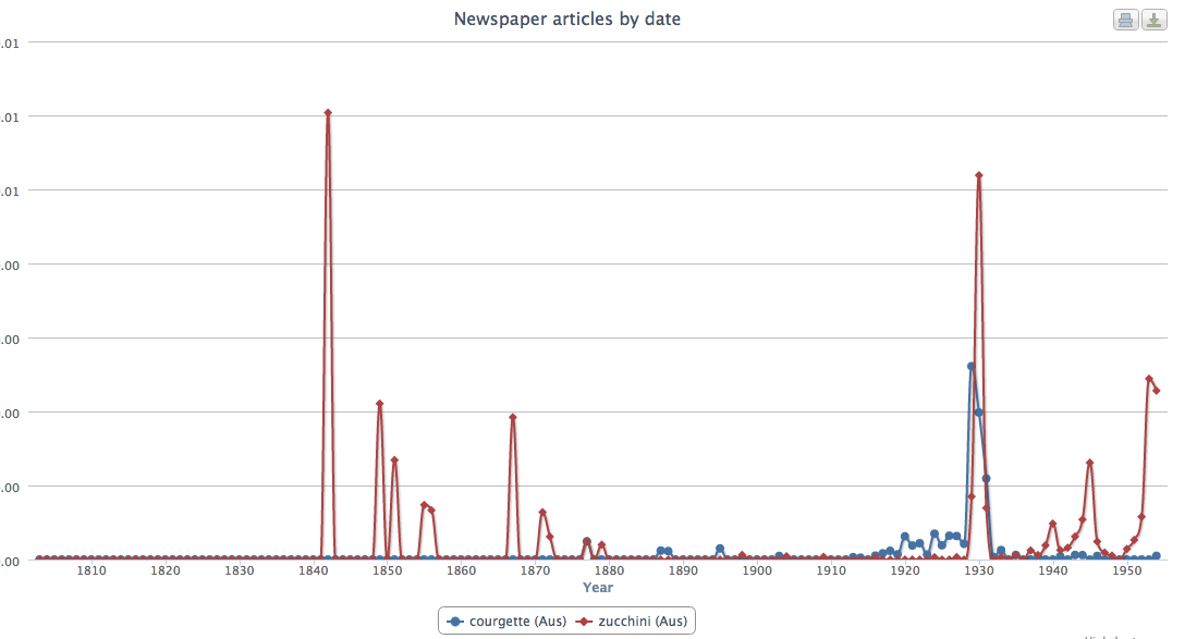 In Australia we mostly say zucchini, probably as a result of the large number of Italian migrants from the fifties onwards. Unfortunately there’s no convenient dataset that goes all the way to the naughties but using querypic to look at the Trove digitized newspaper data from the early nineteenth century to the fifties we seem always to a have preferred zucchini to courgette: