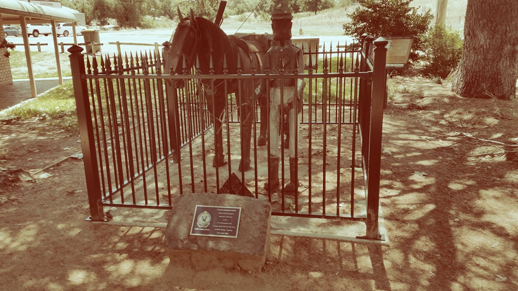 Well happenstance is a wonderful thing. Yesterday on our way back from Canberra we stopped in Jugiong to go to the loo and eat lunch in the park, as we often do, but as it was a hot day I parked under a big pine tree next to a modern bush style sculpture of a nineteenth century trooper and his horse.