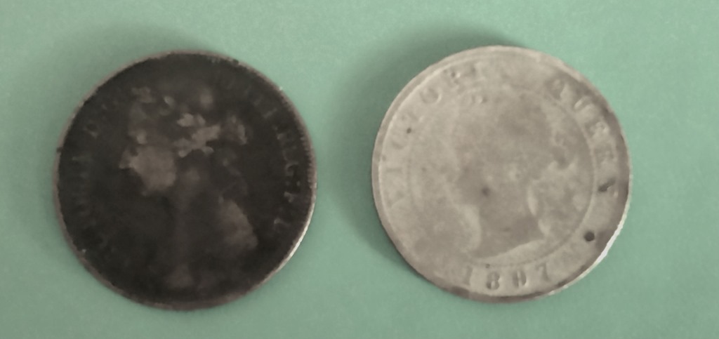 If you look at the side by side images above you can see that apart from being the same size and weight, the coins differ markedly in design. In fact the only common element seems to be the use of the Leonard Wyon bun head – and that’s only because the coin is worn. In fact they used a different head by Wyon in which Queen Victoria compliments her bun head hairstyle with a diadem. The same design turns up on Channel Island coins as well as other places.