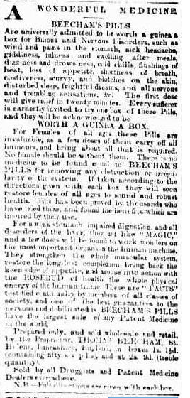 Holloway’s and Beecham’s pills being widely available, Holloway in particular advertising his products widely in the goldfields. In fact Holloway was noticable for his heavy use of advertising. Hollowy’s pills seem to have, like Beecham’s pills, contained aloes, myrrh, ginger and soap, and aloe juice can induce a miscarriage, which is why most probably both Beechm’s and Hollway’s pills worked.