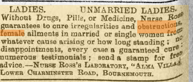 As much of the advertising for such products flew under the radar in a cloud of euphemism it was difficult to work out a suitable search strategy, so I decided to settle on a search for one particular mid Victorian euphemism – female obstruction.