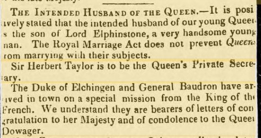 The Exeter and Plymouth Gazette of the same date, follows its coverage of William IV’s funeral with a similar and longer article about Queen Victoria’s future husband and how the Royal Marriage act – which essentially states that all marriages by members of the Royal family require the approval of the reigning monarch – does not preclude Victoria marrying Elphinstone.