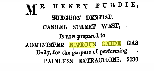 Much the same as New Zealand, with the first mentions of nitrous oxide as a dental anaesthetic in 1870 and adverts by dentists for extractions under gas following not long afterwards.