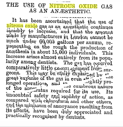 Even so, the death of an 88 year old woman in England who had died while having her teeth extracted under nitrous oxide anaesthesia garnered a fair amount of coverage, but then people are always suspicious of new things and stories about mishaps involving new treatments always help sell papers …