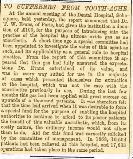 Which is rather interesting given that Horace Wells only first demonstrated the use of nitrous oxide in December 1844 and his second demonstration was not at all successful, meaning that nitrous oxide was not widely adopted as an anaesthetic.