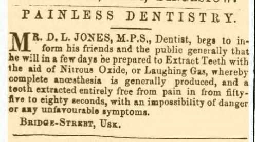 Well not quite, but following on from my recent post about how , round about 1870, nitrous oxide became the anaesthetic of choice for dentists in New Zealand and Australia, I decided to see how much earlier the adoption was in Wales by searching Welsh Papers online.