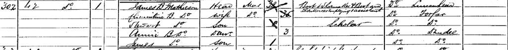 Clementina, as we would expect is still alive, Stuart is in school and both Annie and James are too young to go to school. My great grandfather is a bootmaker, and obviously doing well as he’s employing an assistant.
