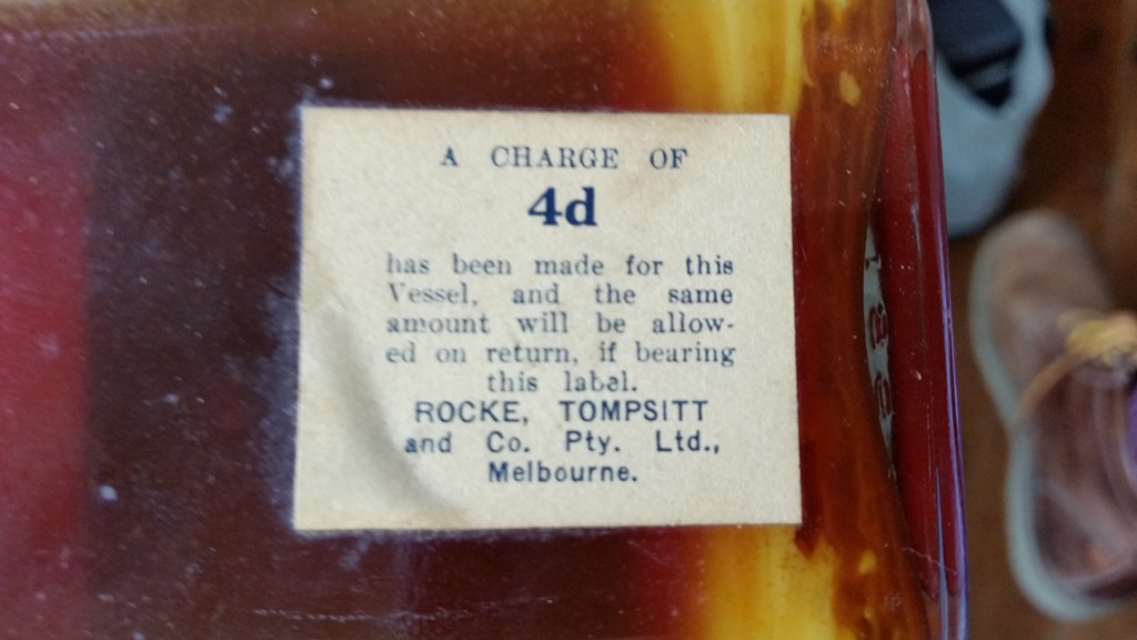with a sticker on the back informing that a deposit of 4d – quite a substantial amount of money then, and in purchasing terms a hell of a lot more than the 10c container refund you get in South Australia today.