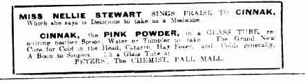 And who was Nellie Stewart ? Well wikipedia was my friend here. Nellie Stewart was an Australian actor and singer of the time who was known for her roles in light comedies and operettas – so an obvious choice for someone to endorse a cold cure …