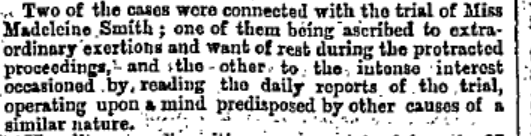 which is interesting – unfortunately the reports don’t give the gender of the afflicted individuals, so I can’t say if the first person mentioned was a member of the legal profession (presumably male) who was stressed by the (for 1857) extremely salacious nature of the trial and depositions and suffered from stress akin to facebook content moderators dealing with confronting content.