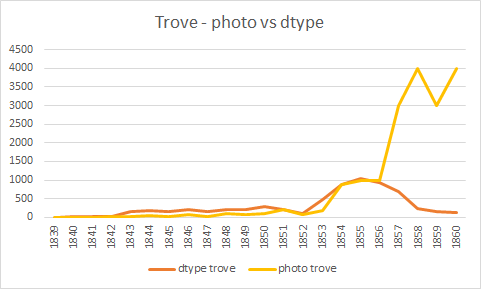 So, in the Welsh data we see that the data more or less matches the Google Ngram data with the crossover occurring about 1855. Interestingly, the Trove data shows something else, with both terms being used equally in the first few years of the 1850’s, with use of the term photograph taking off in 1856.