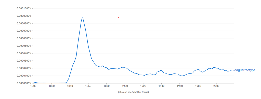 Well to find out I did some very simple investigations – first of all I used the Google Ngram viewer to look at the yearly occurrence of the term daguerreotype in the English corpus: