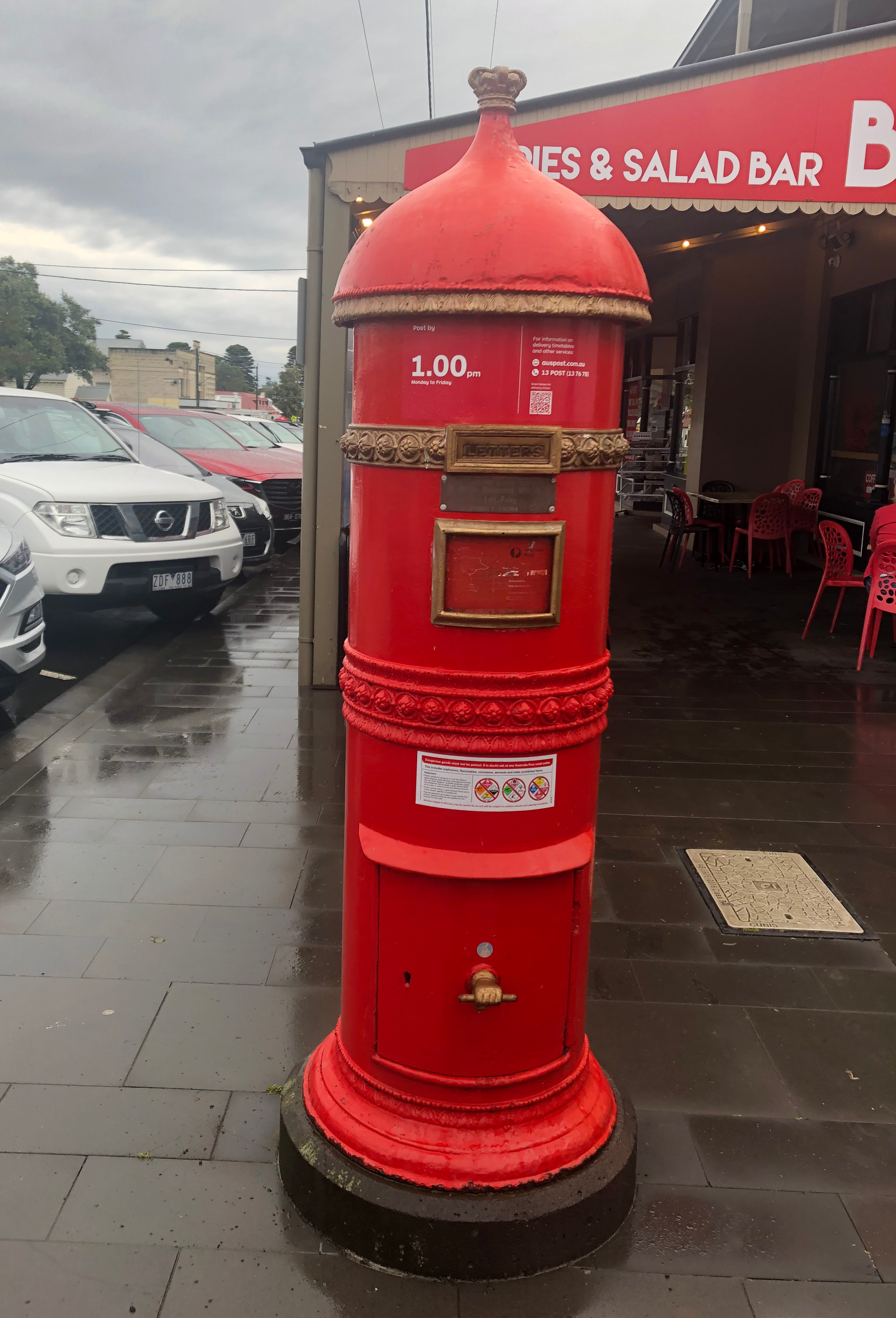 Well I was back in Port Fairy a few days ago and can report that the mailbox has a bright new coat of paint, including a touch of gold on the crown, rim, and door handle: