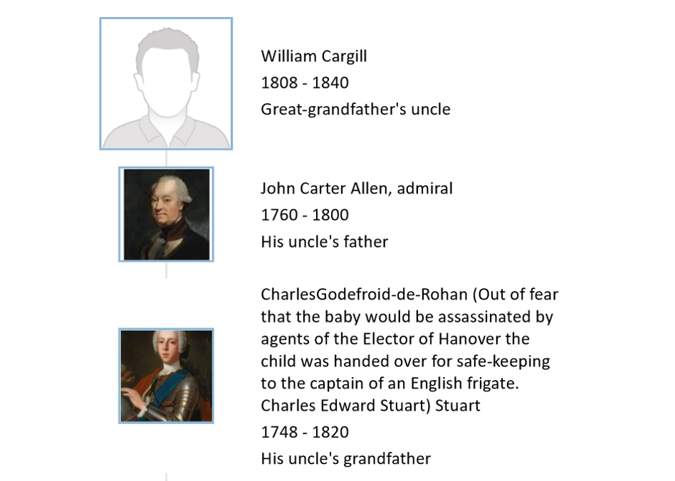 The genealogist Antony Camp has researched them extensively and found no evidence for their descent from Charles Edward Stuart. It’s just possible Thomas Allen was the son of Charles Edward Stuart, but there’s no evidence to support it.