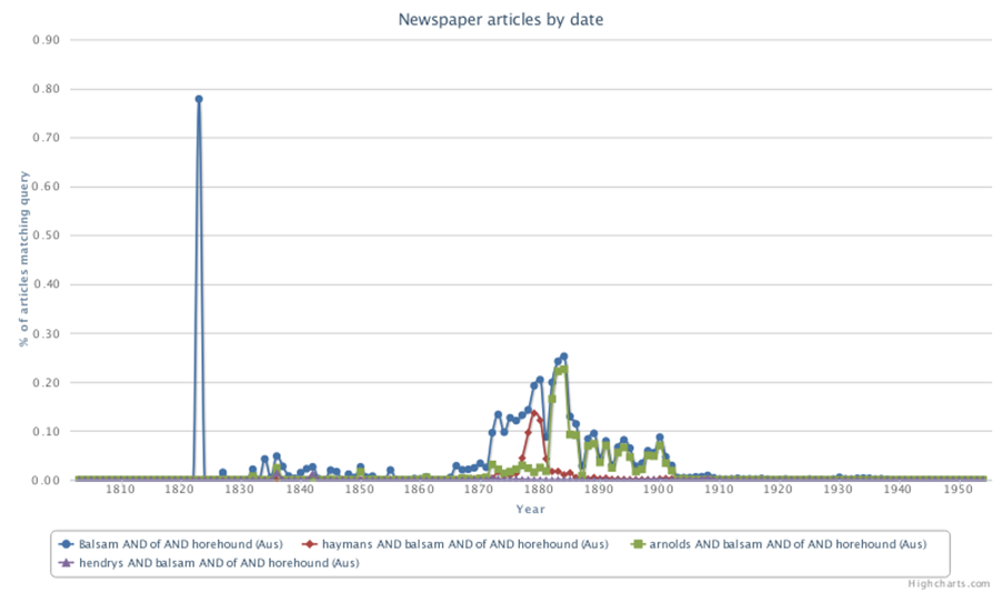 I searched for “balsam of Horehound” on both Trove and Papers Past and counted the relative occurrences of individual brands for the first ten pages on each site.
