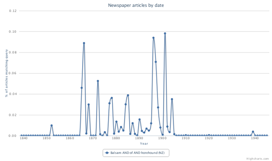 In New Zealand, mentions of Balsam of Horehound start to become significant a little earlier than in Australia and appear to be a bit more ‘peaky’. I don’t have an explanation for the peakiness of the data – one hypothesis I could conceivably test would be winter rainfall to see if products were advertised more heavily in wetter years.