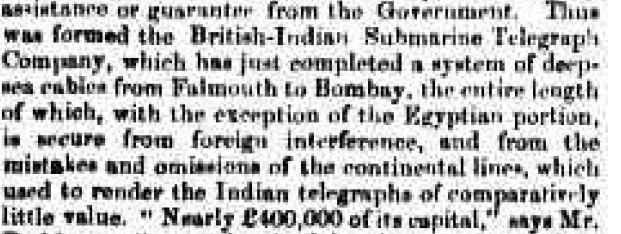 So, a group of British capitalists, who had already successfully built the second, successful, transatlantic cable, financed the laying of a cable from Bombay (now Mumbai) to Aden, which was then a British protectorate, via Egypt, which was nominally independent but a British protectorate in all but name, to Malta, Gibraltar and Falmouth (actually Porthcurno), meaning that the entire route was under British control.