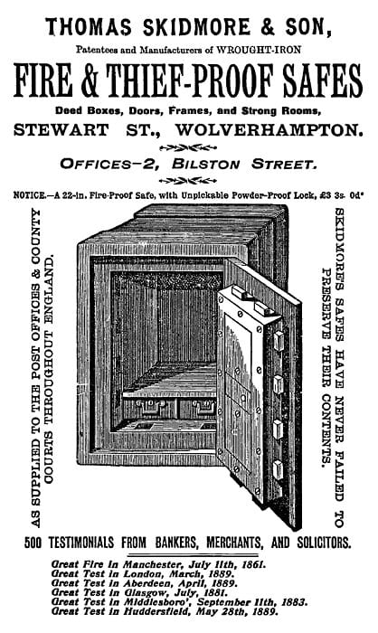 While Thomas Skidmore went out of business in the 1920s, their safes are still well regarded, and a scan of various auction sites shows them continuing to command high prices – around £2000 (say a little under A$4000) for a good example in working order.