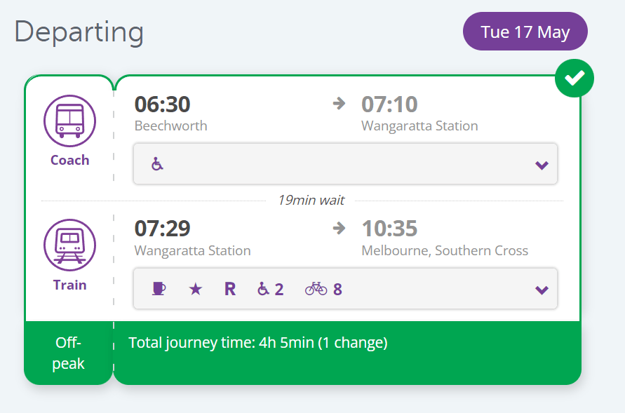 The distance from Beechworth to Melbourne is a little under 300km. Just for fun I used an English train booking website to see how much the same journey (say from London to York) would cost
