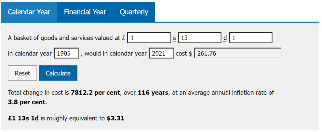 The Reserve Bank of Australia have an inflation calculator allowing you to work out what a pre-decimal sum of money would be in today’s dollars. The sum needs to be entered as pounds, shillings, and pence (being old enough to have learned how to calculate money in pre-decimal days helps) we get the following result