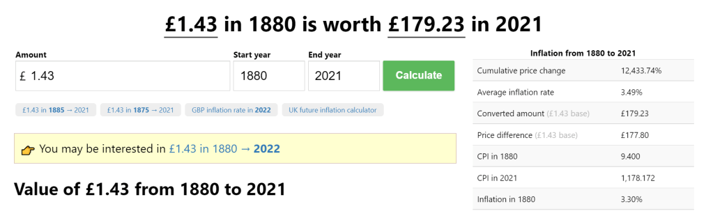 So, making the assumption that a pound in London in 1880 had the same purchasing power as a pound in Melbourne we can use a British inflation calculator