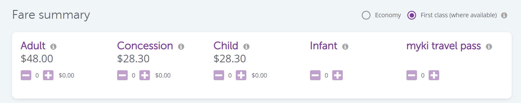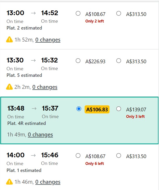 The website helpfully calculated the fare in Australian Dollars for me so we can see that a LNER economy ticket is on average roughly twice a V/Line first class ticket for the same distance, and that in most cases a first class ticket is more like the 1905 cost of a first class ticket on V/Line’s predecessor, Victorian Railways.