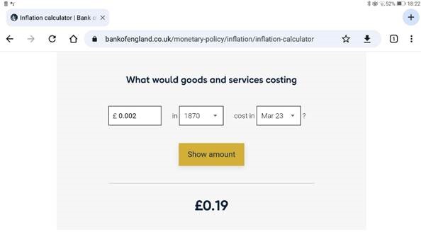 (The Bank of England’s inflation calculator assumes you convert your price to British post 1971 decimal currency. As there were 240 pre decimal pennies to the pound, there were 480 half pennies, making the half penny worth around £0.002 in post 1971 currency).
