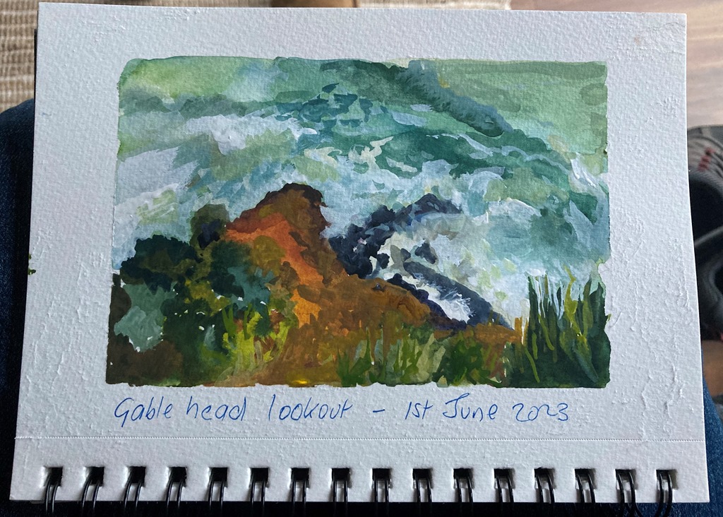 After some humming and hawing we decided to try the Wreck Beach walk. Having checked the tides, we reckoned we had a chance of being able to see the anchors of the Fiji and Marie Gabrielle, but no chance, the wind was pushing the waves onto the beach making it foolhardy to even venture down onto the beach. The surge was even worse than when we had tried in 2018, so as in 2018, we had a walk through the scrub to Gable Head and some dramatic views of the surging sea.