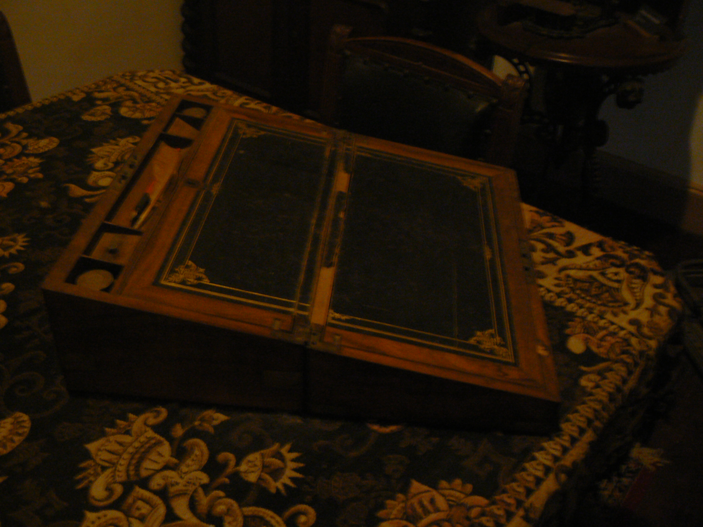 First of all you needed a bottle of ink and a dip pen, and possibly some blotting paper. Rather than writing on a flat surface as we do, if you were sophisticated, you used a either a desk or a writing box with a slope to it, the idea being that if you used a slope it was easier to sit upright and avoid accidentally blotting what you had written on the previous line with your cuff.