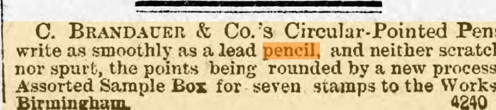 What we don’t have are ordinary wood and graphite pencils, because on the whole they were used and when they were no more than an unusable stub, thrown away, but stationers’ adverts from the time routinely list them.