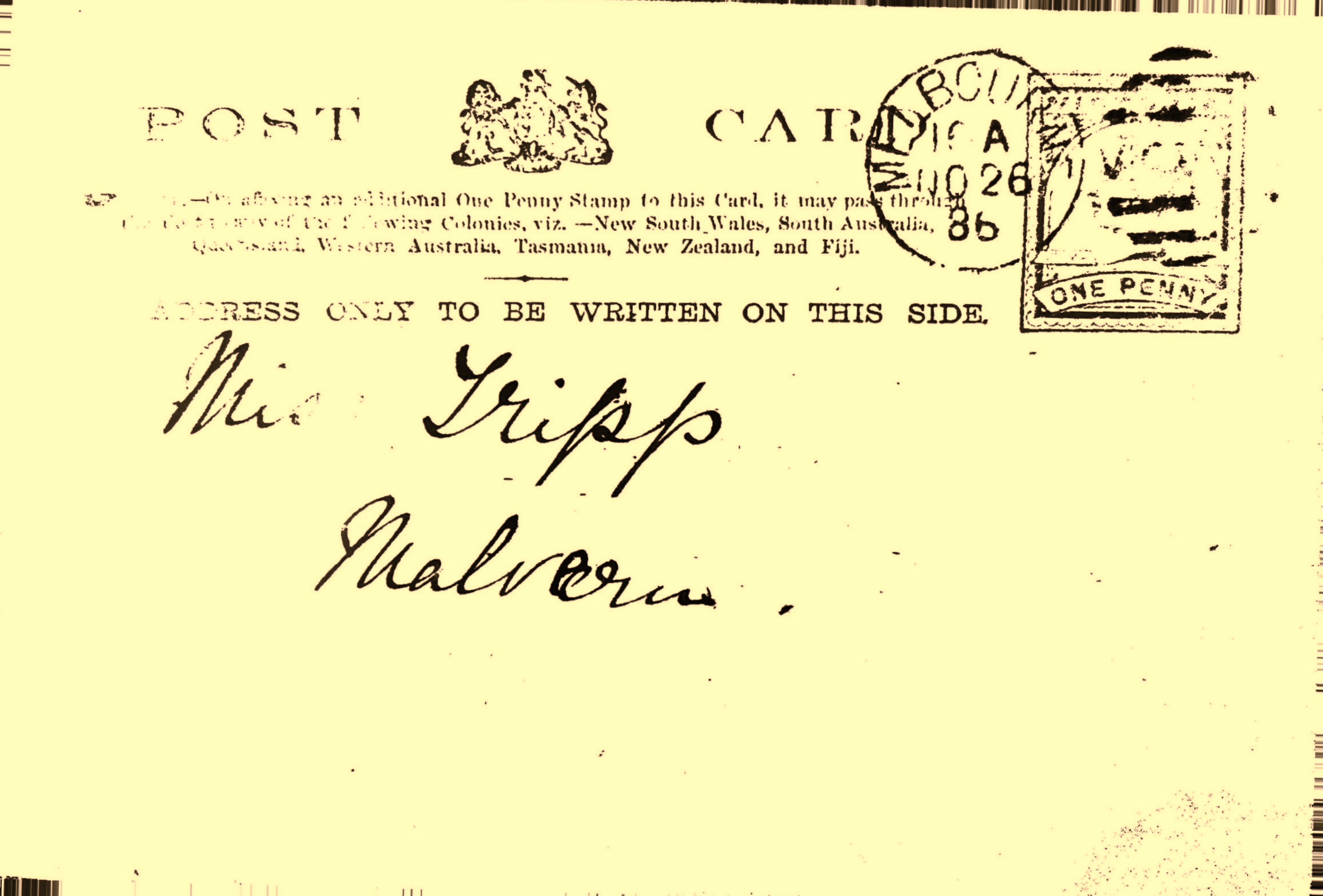 I’m not a serious post card collector, but I’m fascinated by the way people in the late nineteenth century used post cards much in the way we use text messages and emails, and occasionally, when I’ve some spare cash I’ll scan the various auction sites for ones that look potentially interesting and one I’ve come across recently is one from 1886 addressed to a Miss Tripp in Malvern – Malvern is now an upmarket inner city suburb of Melbourne and by 1886 would have been connected to the city by train (1879).