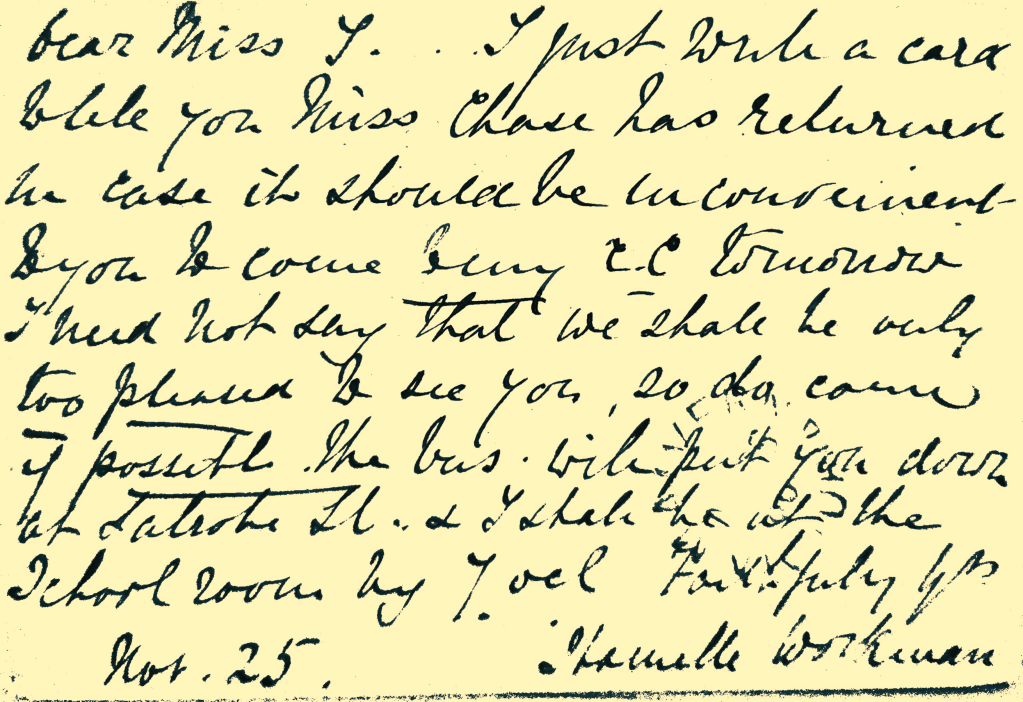 The message is quite simple – a Miss Chance, clearly known to both of them has returned, and they would like to meet up if at all possible, and if she caught the bus it would drop her in Latrobe St where her correspondent would meet her at the school room at 7 O’clock. (There were no trams in Malvern until 1910, so it would have been a bus or train ride to the city)