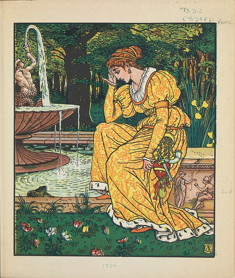 Walter Crane worked with William Morris and others in his arts and crafts group producing faux medieval paintings. When he turned his hand to children’s fairy tales not surprisingly he stayed with the faux medieval theme drawing fairies and princesses with flowing tresses and impractical drapery.