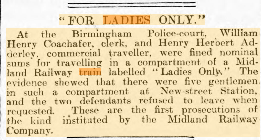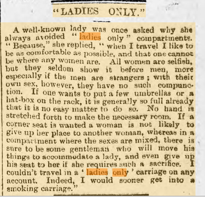 I suspect the above article may have been planted by one of the railway companies to discourage the adoption of ladies only compartments but it does show how they were perceived as inconvenient and annoying.