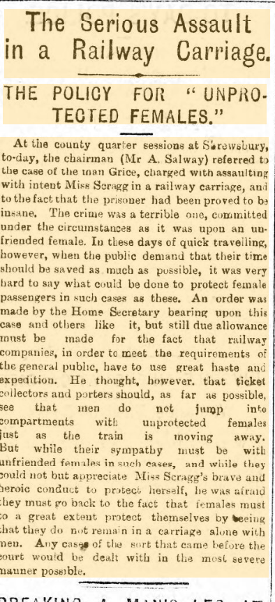 This did invite some comments along the lines of ‘she were asking for it, warn’t she’, and comments from the chair of the grand jury about women having to take responsibility for their own safety, but these didn’t go anywhere given the brutality of the attack and the fact that she had been sitting in a compartment with other passengers prior to Grice boarding the train – he could just as easily have leapt into a Ladies Only compartment occupied by a single woman.