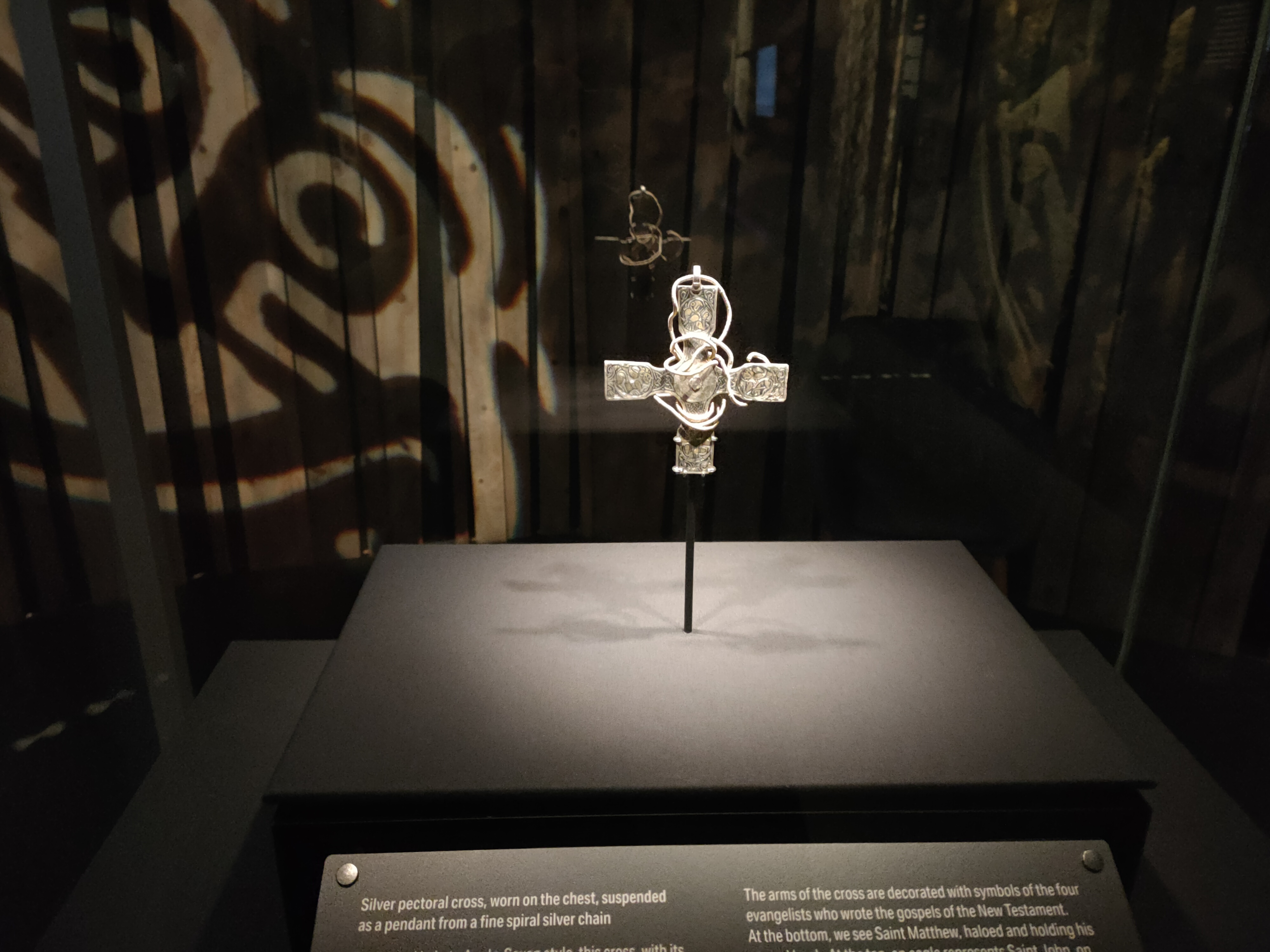 The exhibition is quite small but contains the pectoral cross, some disc brooches and some of the hacksilver. Some of the rock crystal artefacts and a vessel that was found wrapped in textile are not original but in fact 3D printed replicas, perhaps because the originals were deemed too fragile to travel from Scotland.