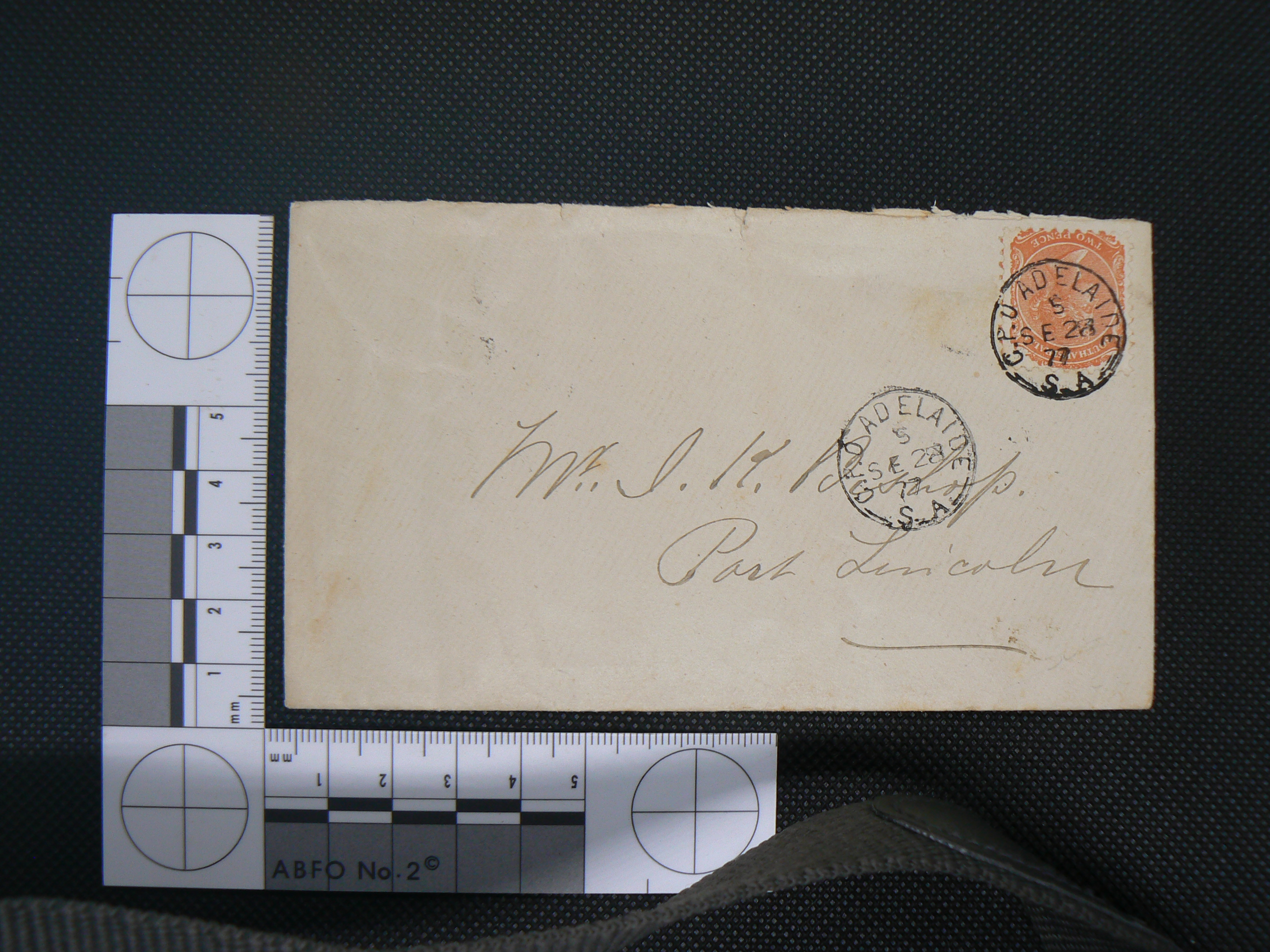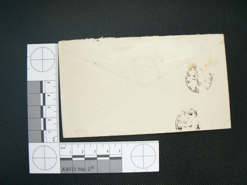 It’s an example of a postal cover – basically an envelope without its contents – sent from Adelaide to Port Lincoln in 1877, and it’s interesting because of the multiple postmarks on it – two on the front and two (unfortunately illegible) on the rear.