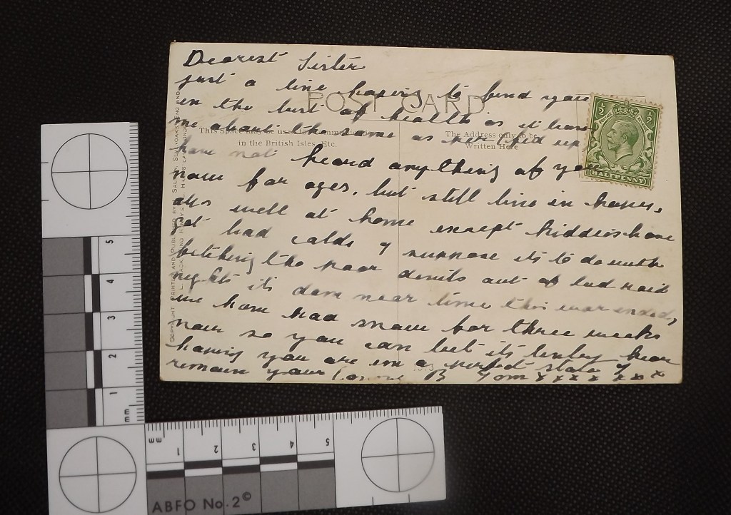 Someone has stuck a King George V green halfpenny stamp on the postcard and then a message has been written using the whole back of the card, including over the stamp.