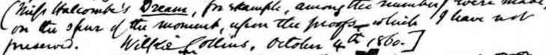 Likewise in the course of researching this blog post I looked at one of Wilkie Collins’ letters from 1860, and towards the bottom of the letter there is the phrase Miss Halcombe’s Dream which looks to have been written Miſs Halcombe’s Dream