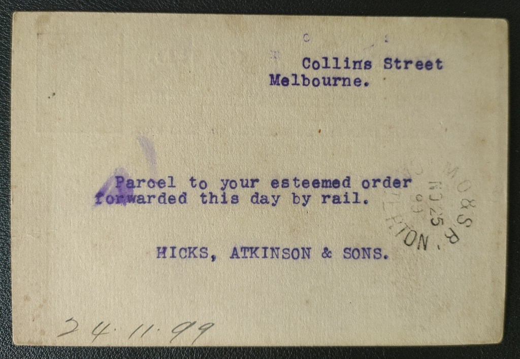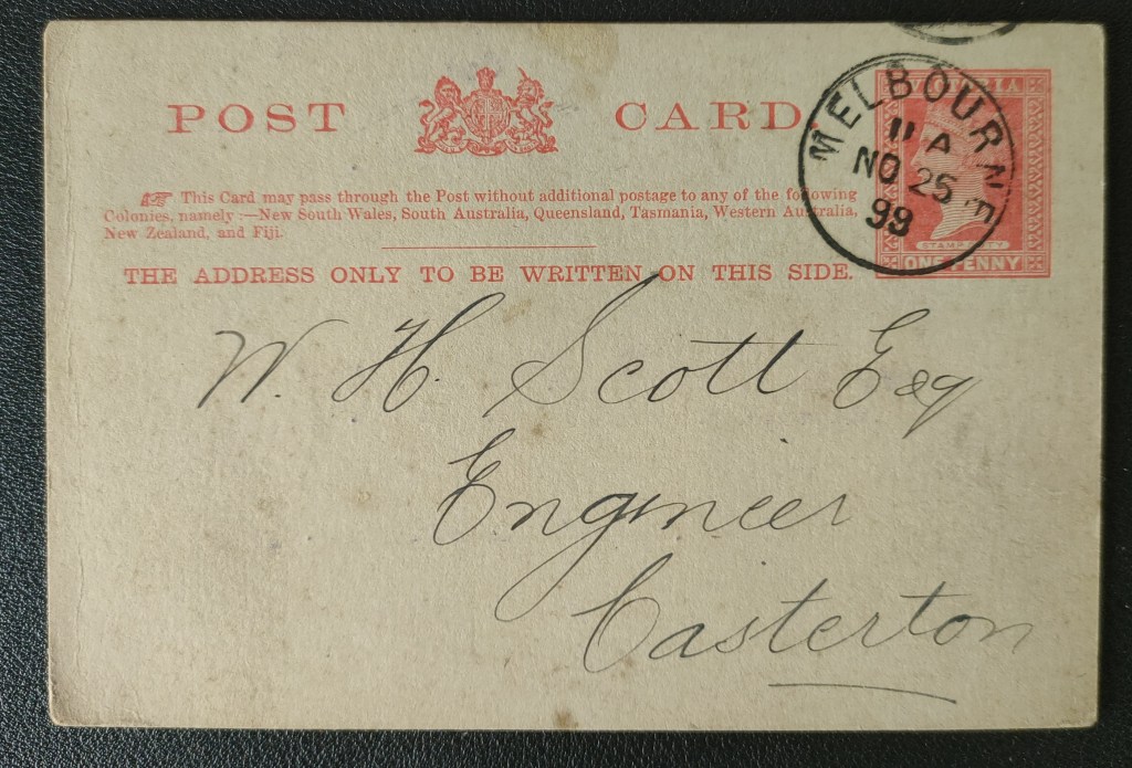 An interesting example this, neatly showing a fusing of technologies – a late nineteenth century postcard, dated 25 November 1899, addressed to W H Scott, Engineer, Casterton VIC.